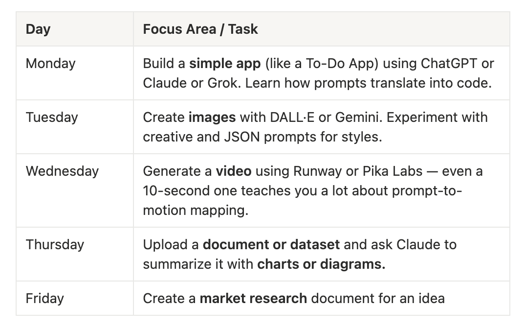 Start the week by creating a basic app, such as a To-Do List application, using tools like ChatGPT, Claude, or Grok. Focus on understanding how natural language prompts translate into executable code. Observe how each model handles logic, UI components, and syntax suggestions differently.