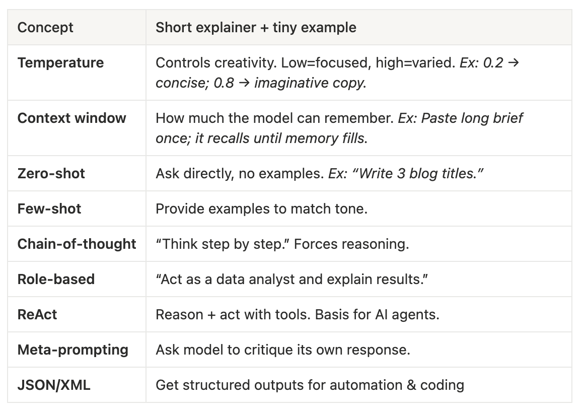 JSON prompting: structure the response. Ex: “List 5 startup ideas in JSON with name, tagline, and target user.”