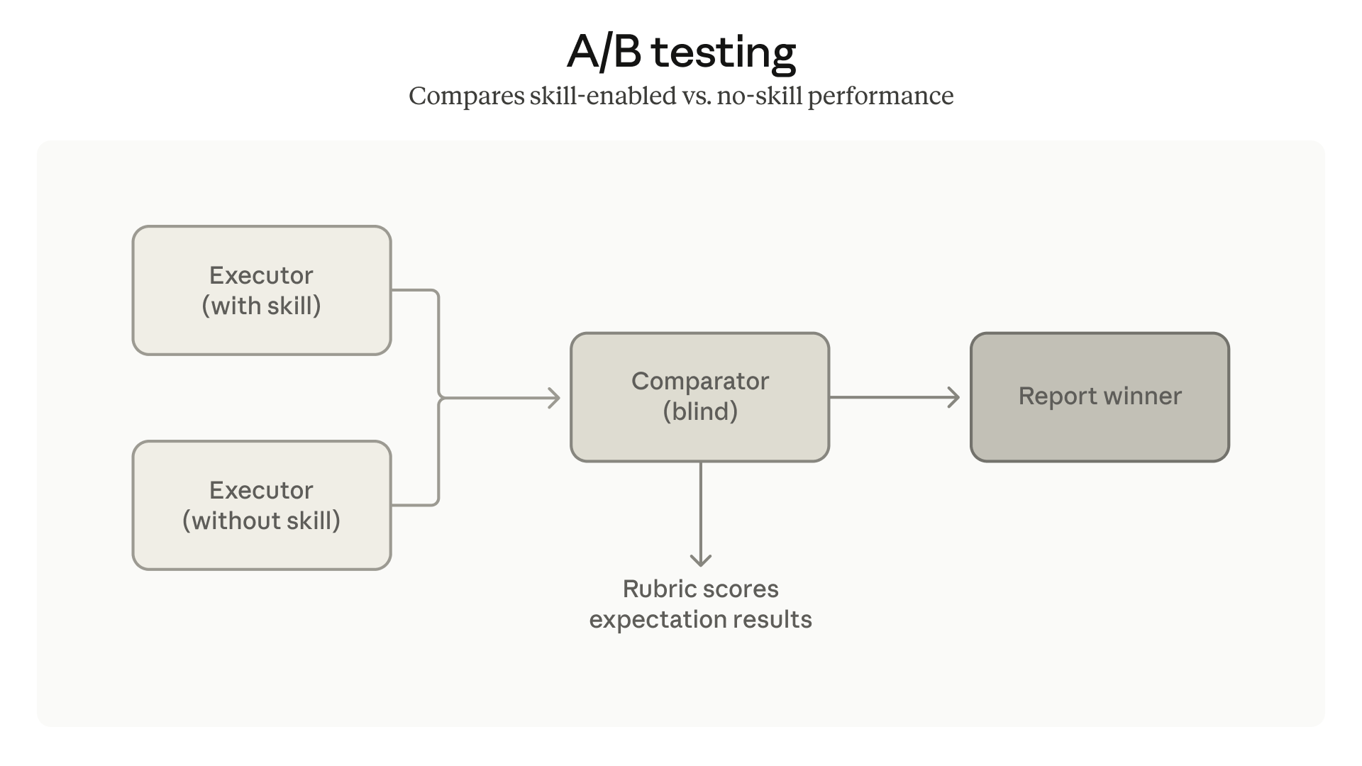 There are also comparator agents for A/B testing. You can compare two different versions of a skill to see which one is better. The AI judges the results without knowing which version is which, so the choice is fair.