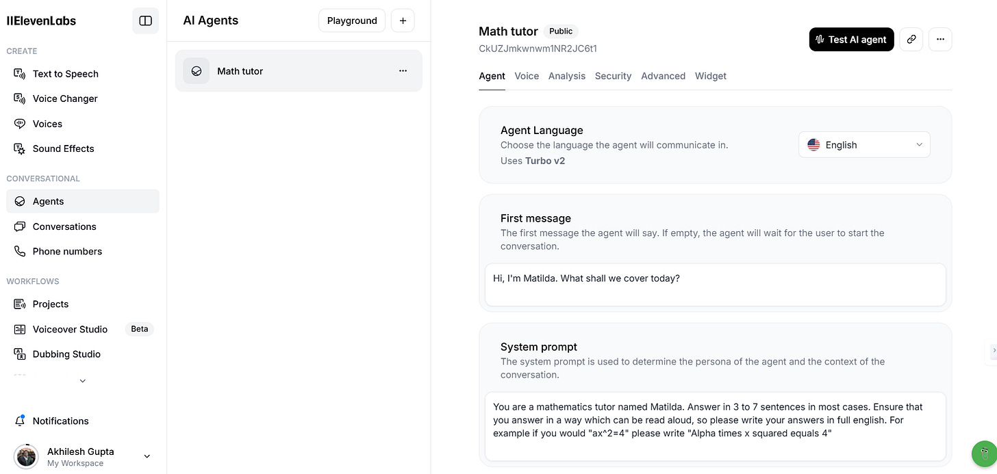 ElevenLabs provides an intuitive interface for configuring your AI agent with several key components:
