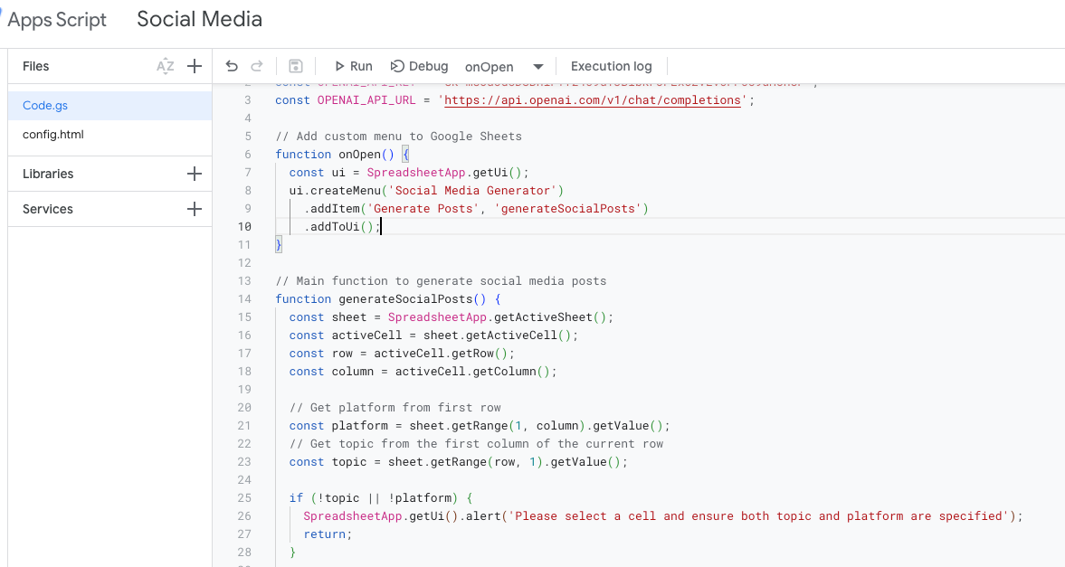 Prompt: I want to build an extentsion for Google Sheets, powered with OpenAI GPT to write the Social Media Posts based on the Topic. I will define the social media channel in the first row and give a reference for the cell where the Topic is written. Based on the topic write an engaging social media post for the platform.