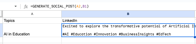 Use the function : =GENERATE_SOCIAL_POST(A2,B1) i.e Topic and the Platform