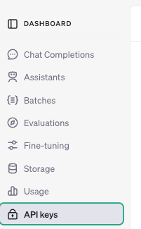 If you don’t have it, create an account in https://platform.openai.com/ and go to Dashboard and then go to API Keys.