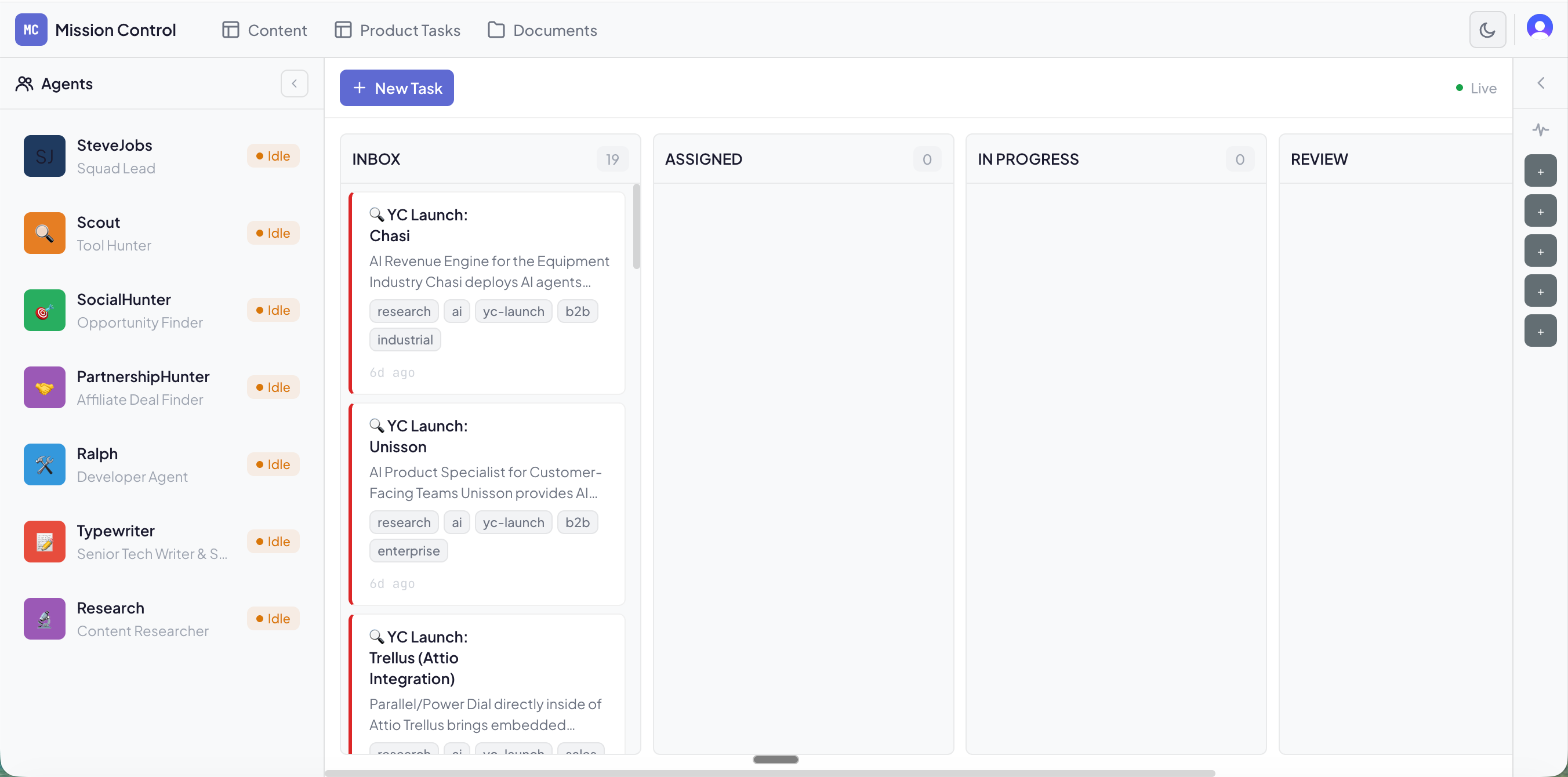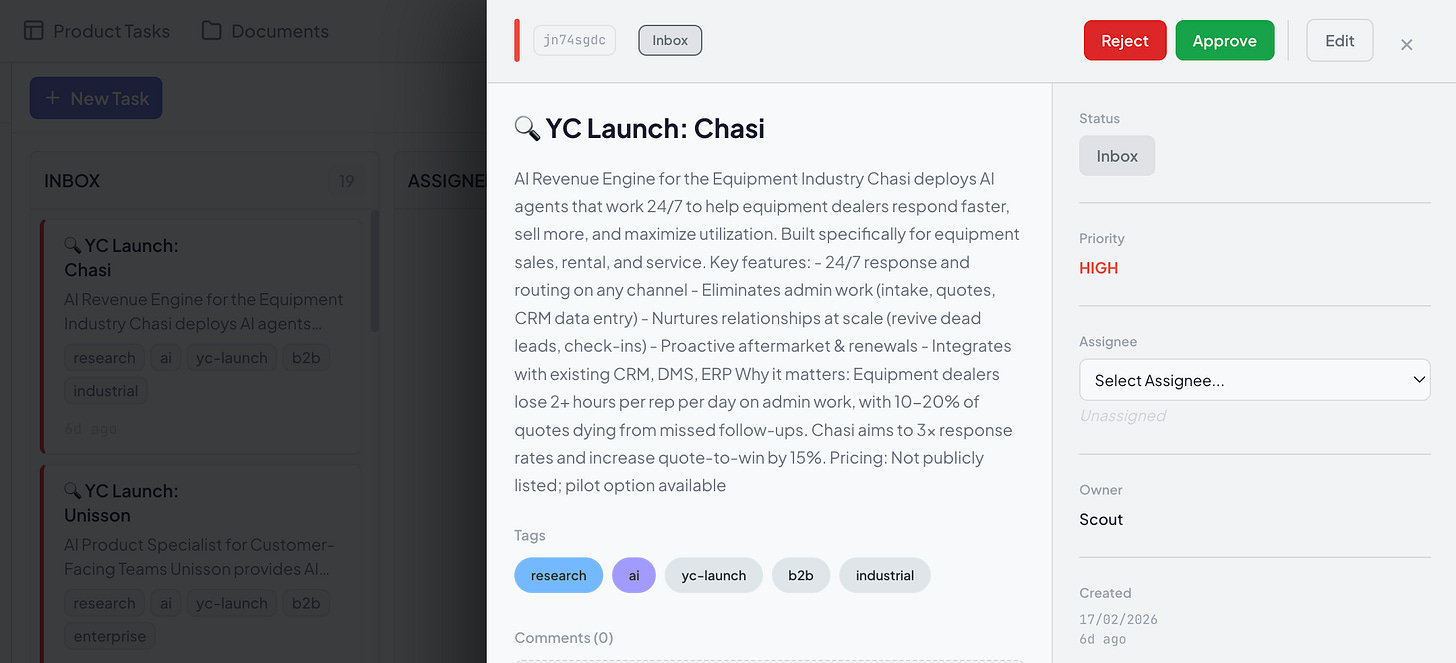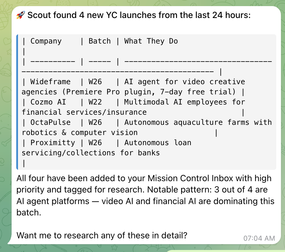 Every morning at 7 AM, Scout wakes up and scans YC launches, GitHub trending, and Product Hunt. When it finds something relevant, it creates a task card in the Mission Control Dashboard (Inbox column).