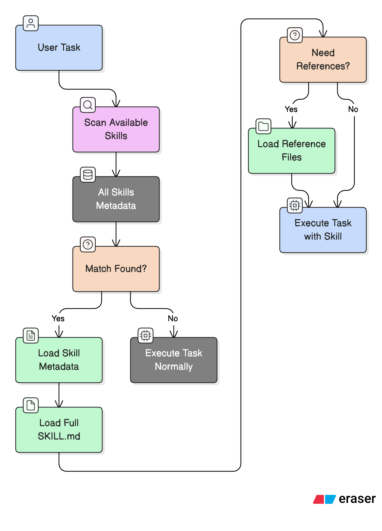 How Skills work: When Claude gets a task, it quickly scans all available Skills to find the ones that match. It does this using progressive disclosure—first loading only lightweight metadata (~100 tokens) so it knows which Skills are relevant. When a Skill is actually needed, Claude loads the full instructions (<5k tokens), and only then pulls in any bundled files or scripts.
