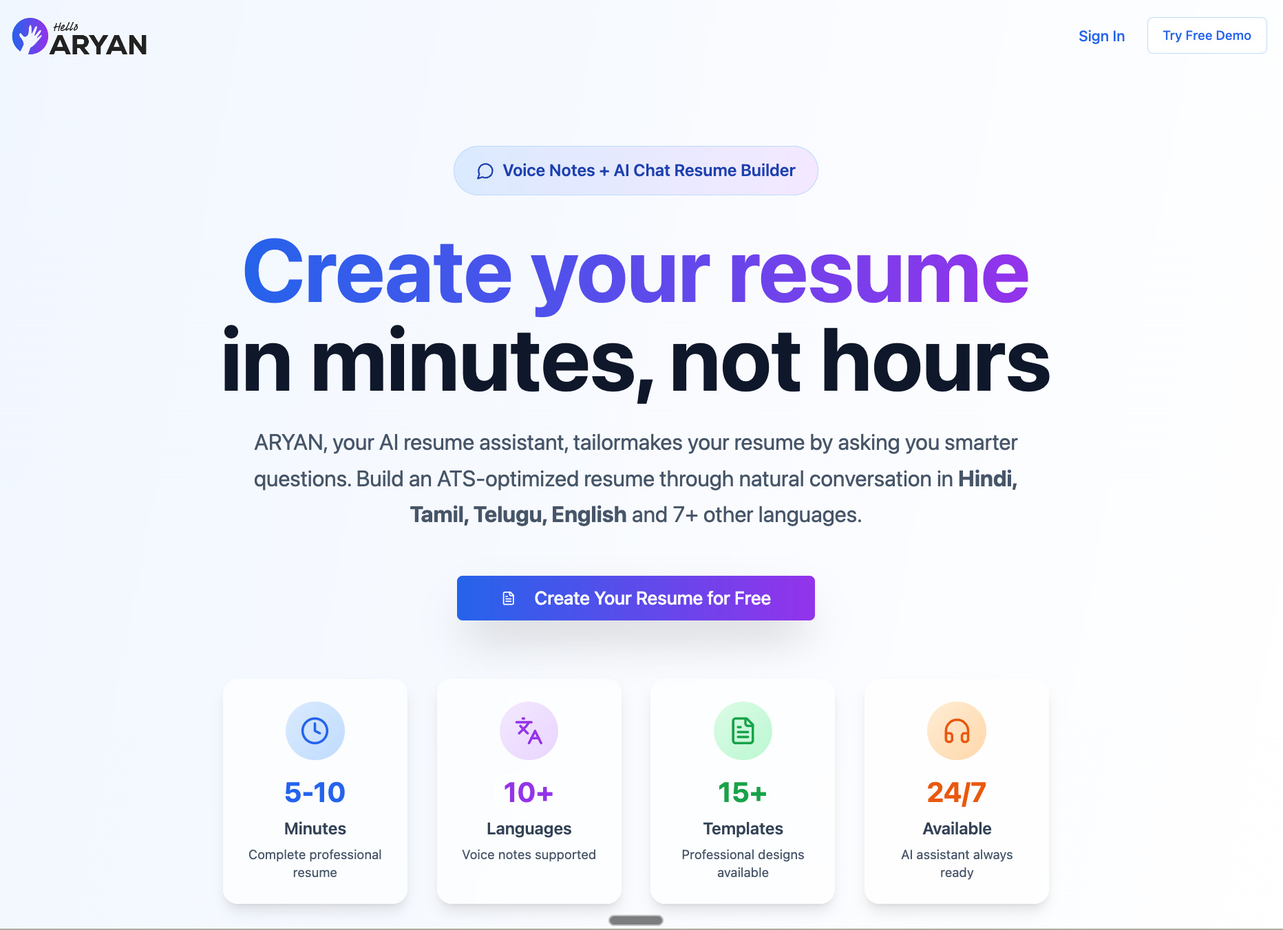 At its core, ARYAN, AI Resume Assistant, is designed for people who face challenges writing their resume in English but are comfortable speaking in their native language. All you need to do is record a voice note—whether in Hindi, Tamil, Telugu, or other languages—and ARYAN transforms it into a polished, ATS-friendly resume.
