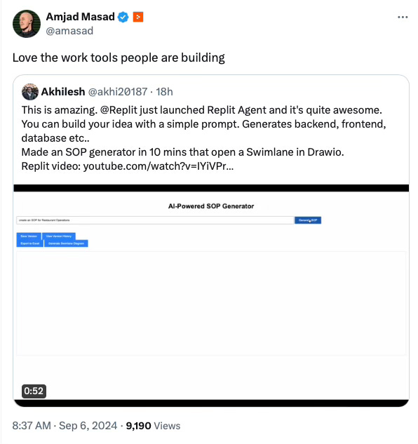Just when I thought Replit couldn't get any better, they launched Replit Agent a couple of days back. This thing is mind-blowing. With just a simple prompt, it can create a fully functional app and host it. I used it to build an AI-powered SOP application that generates SOPs based on written processes and even creates downloadable swimlane diagrams compatible with Drawio.