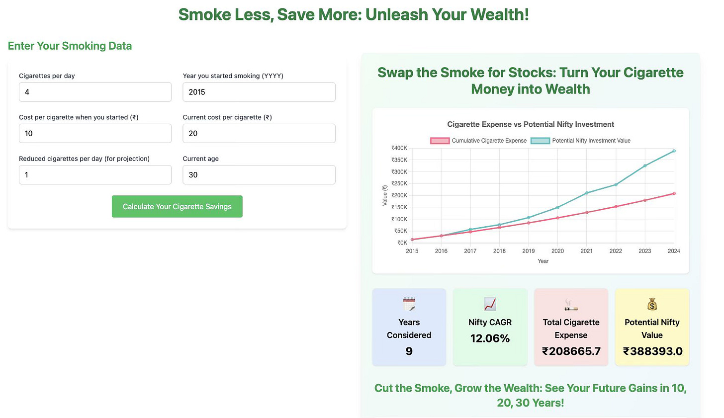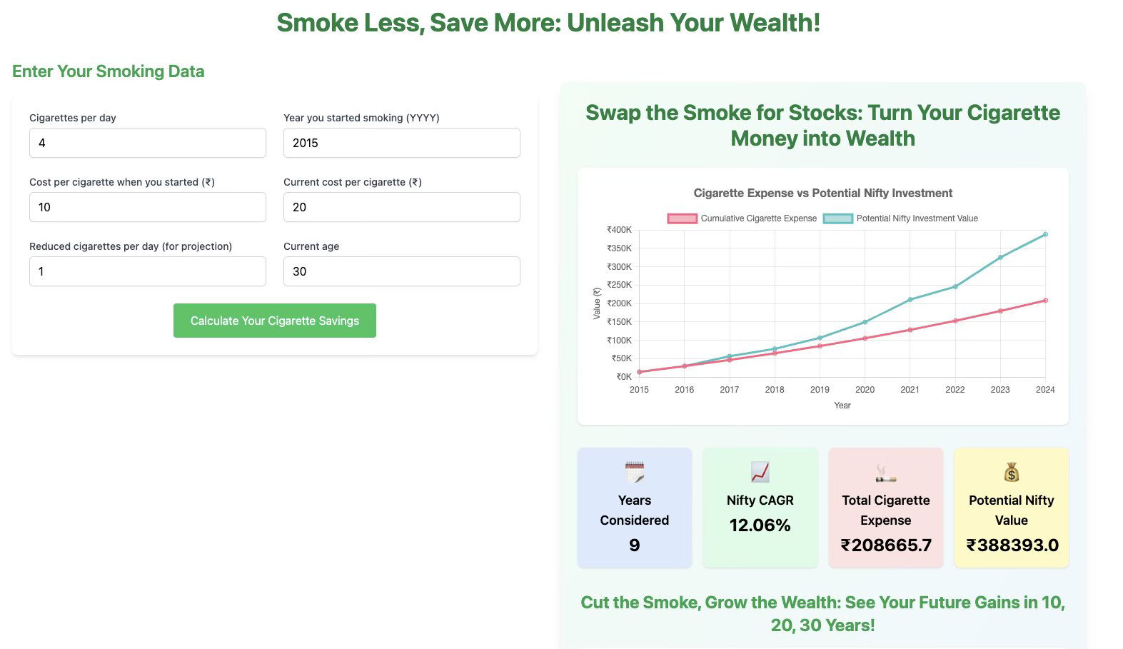 Want to see Replit in action? Check out my other application I hosted: Smoke to Wealth. A calculator that says the money you could have made if you had invested the money you spend on cigarettes in investing in stocks.