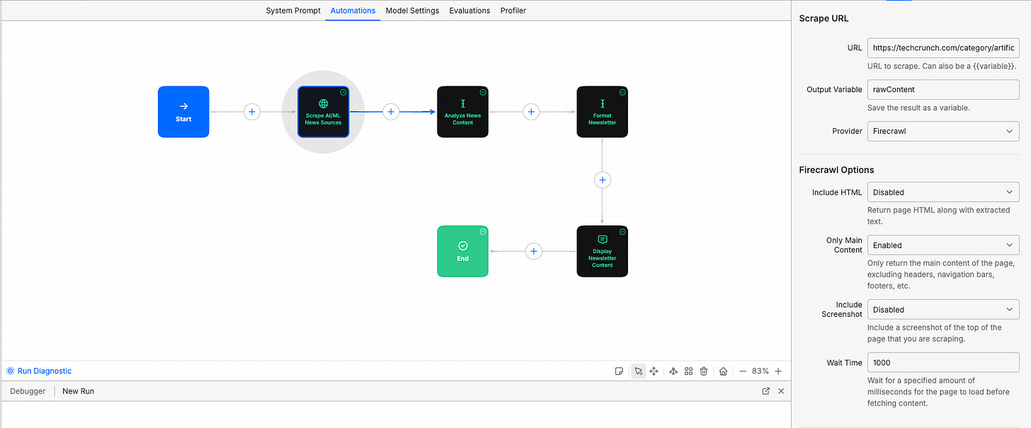 - Workflow Visualization: A flowchart of steps (e.g., Start > Scrape News Sources > Analyze News Content > Format Newsletter > Display Newsletter Content > End).