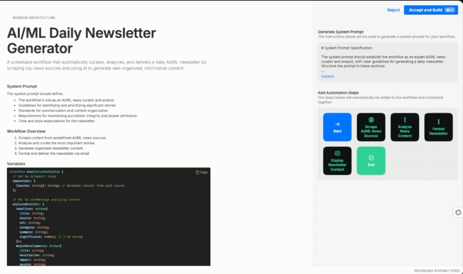 - Efficient Workflow Building: The Mindstudio Architecture feature is remarkable. With a simple prompt, it constructs an end-to-end workflow, eliminating the hassle of starting from scratch.