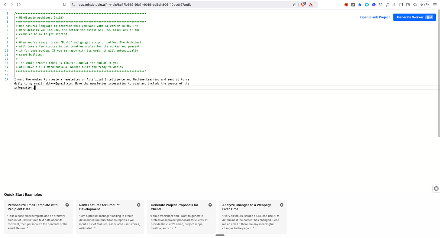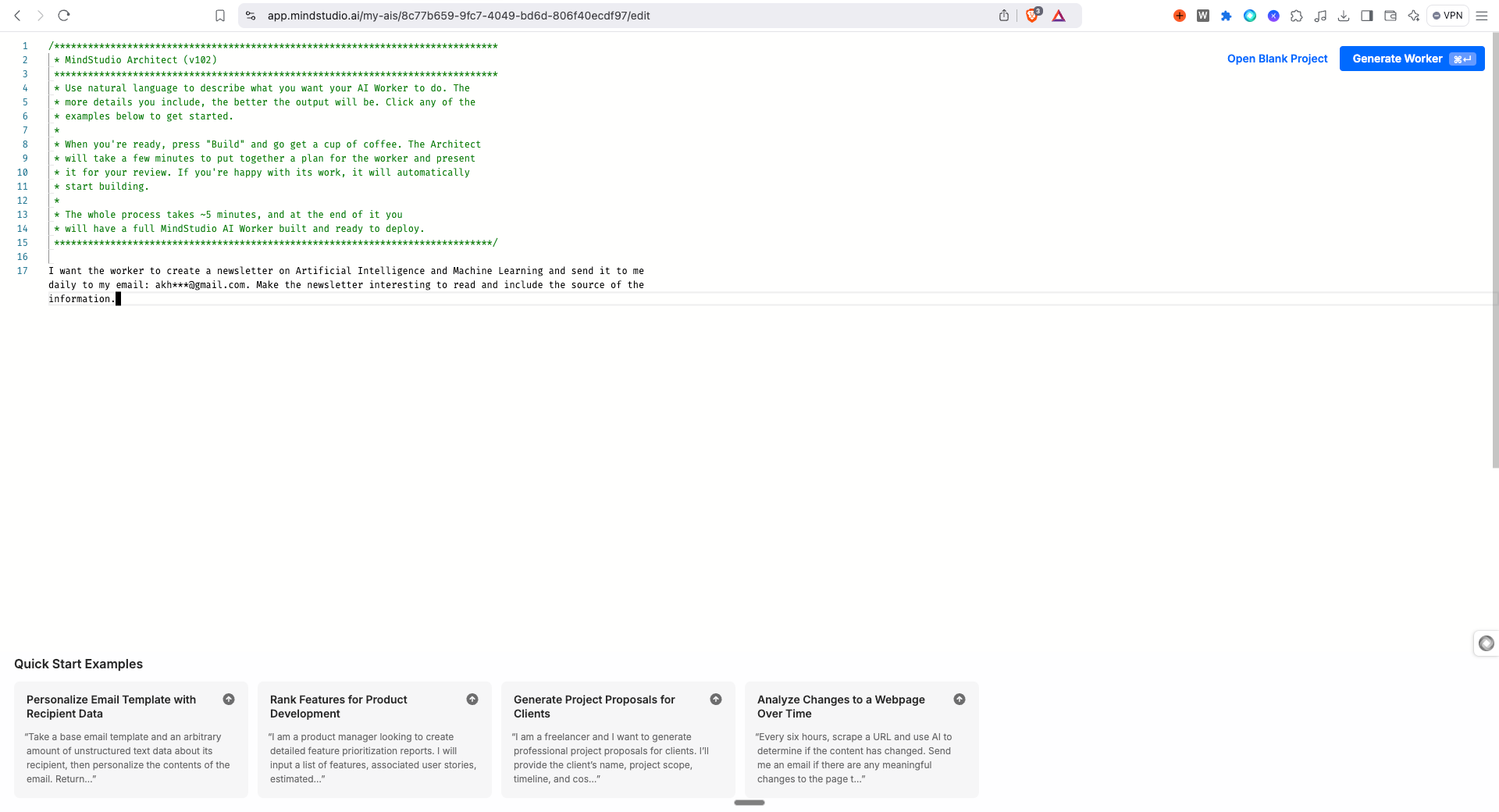 In the top right corner, find and click the "Generate Worker" button. Allow a few minutes for the MindStudio architecture to design the architecture for your idea.