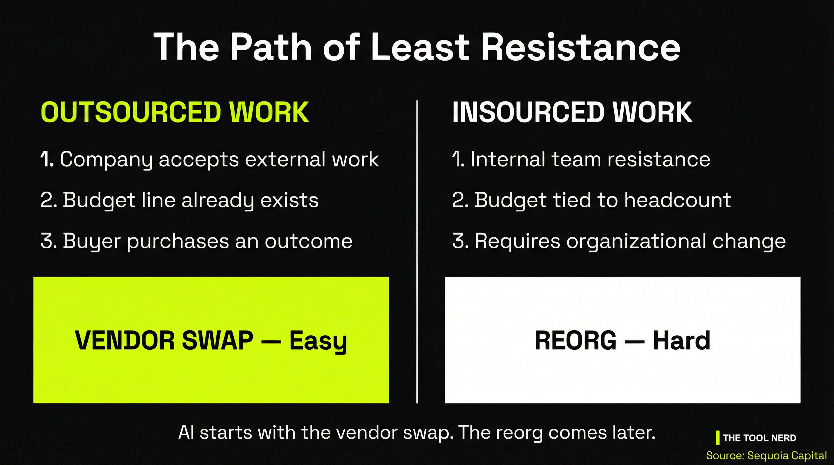Sequoia’s thesis is a wake-up call. The era of selling software as a tool is peaking. The era of selling software as a service - literally doing the work - is just beginning.