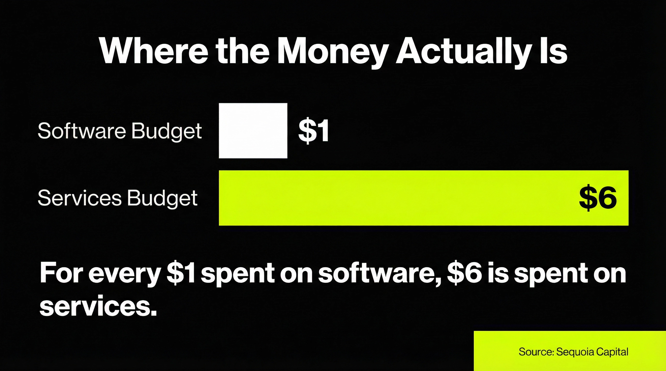 The work budget in any profession dwarfs the tool budget. Traditional SaaS companies fight viciously over that single software dollar. AI-native service providers (Autopilots) are bypassing that fight entirely and capturing the six-dollar work budget from day one.
