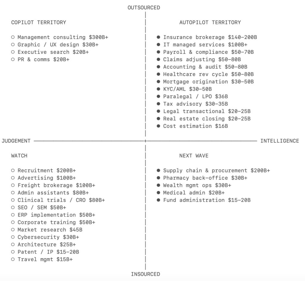 The playbook is clear: companies should start with the outsourced, intelligence-heavy task. Nail distribution. Expand toward the insourced, judgment-heavy work as the AI compounds. The outsourced task is the wedge. The insourced work is the long-term TAM.
