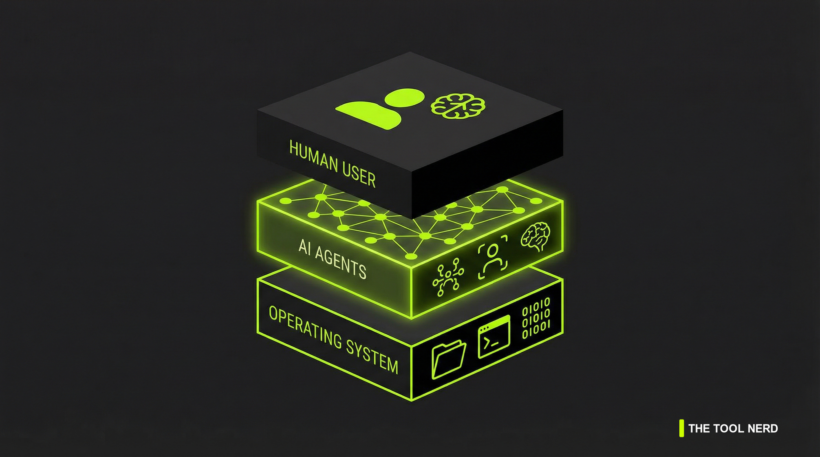 At the bottom, you have your Operating System—your files, your terminal, your native apps. At the top, you have the Human User, assigning high-level goals. In the middle sits the Agentic OS Layer. Tools like Manus, Claude, Codex, and Perplexity act as the bridge. They translate intent into clicks, keystrokes, and terminal commands.